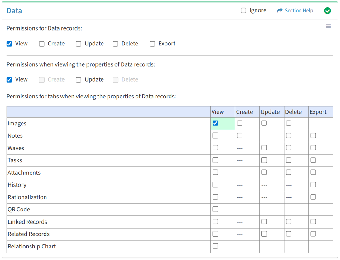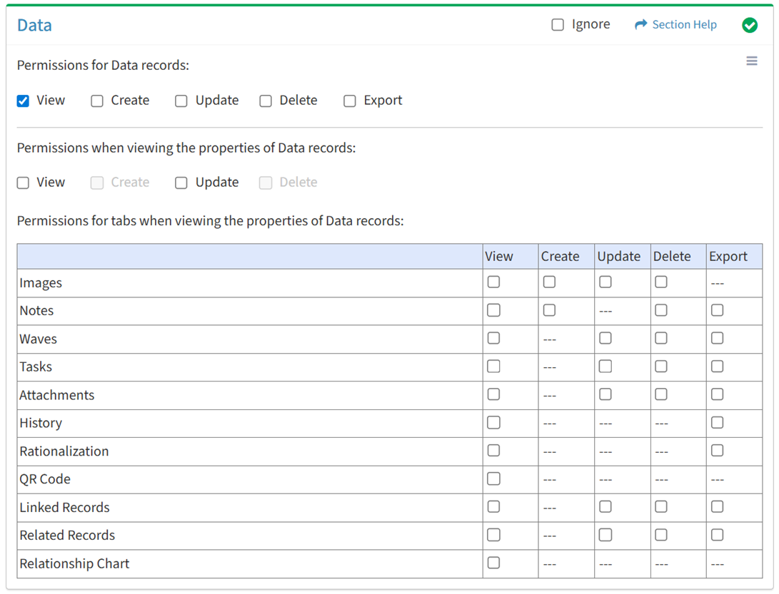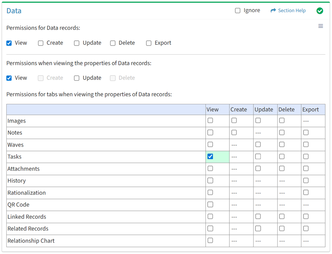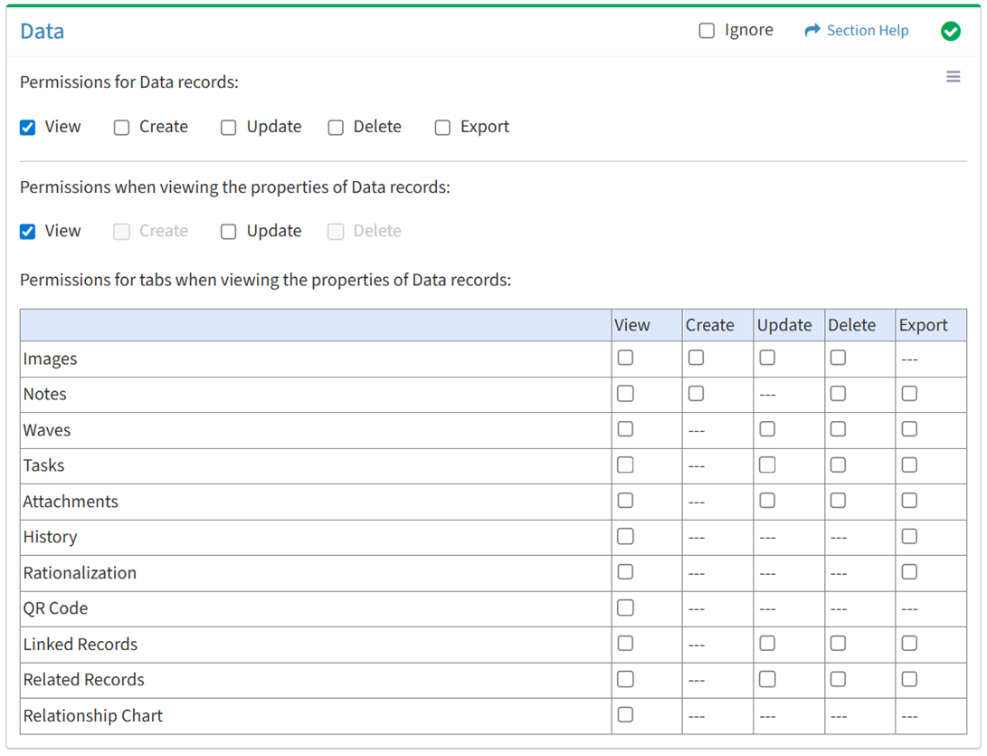 From the Data tab, you can enable View access for linked records when viewing the properties of data.