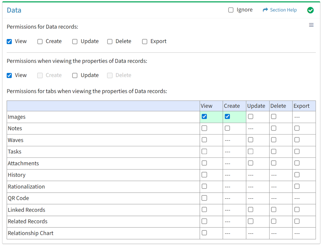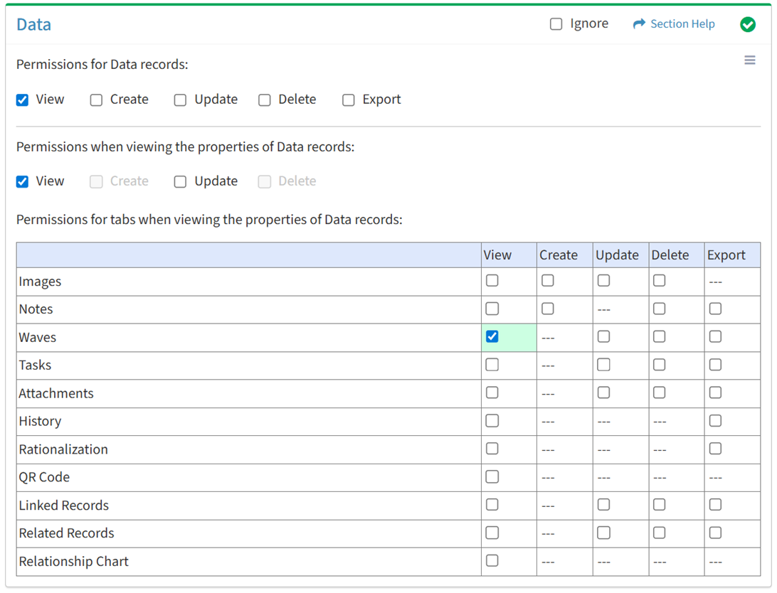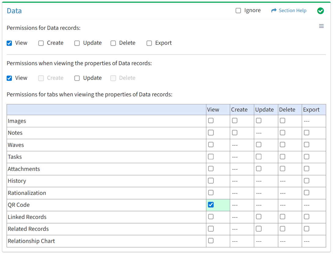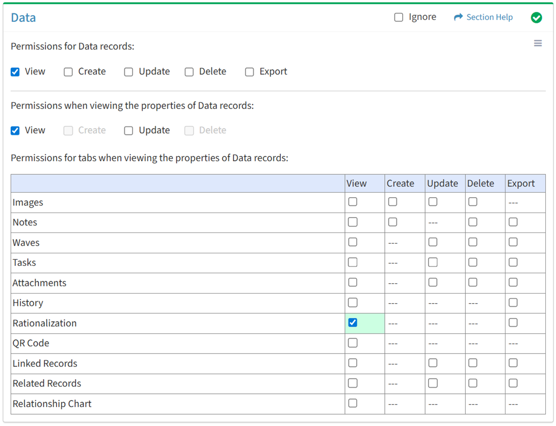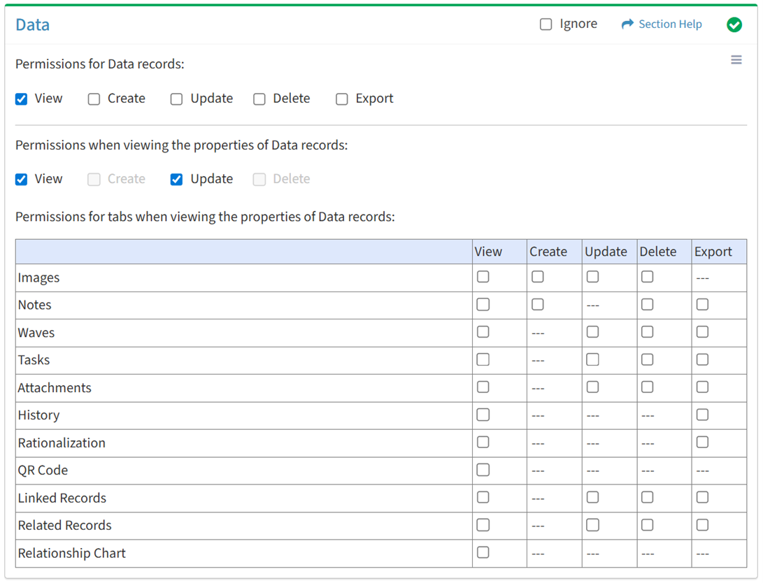 From the Data tab, you can enable View access for linked records when viewing the properties of data.