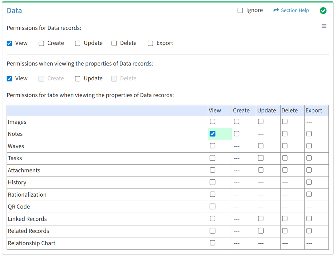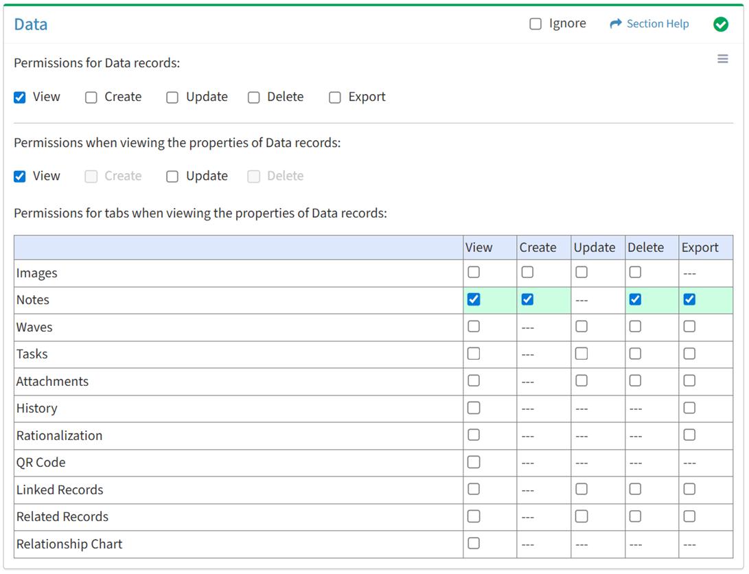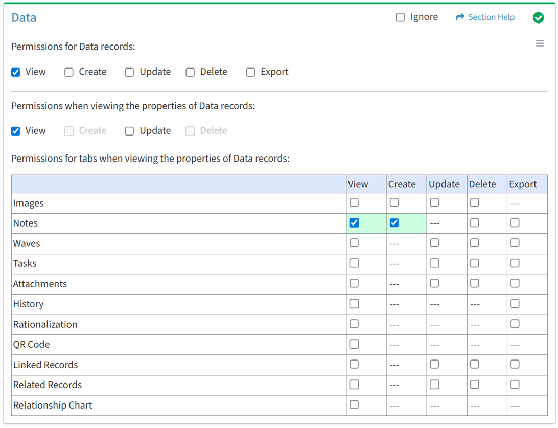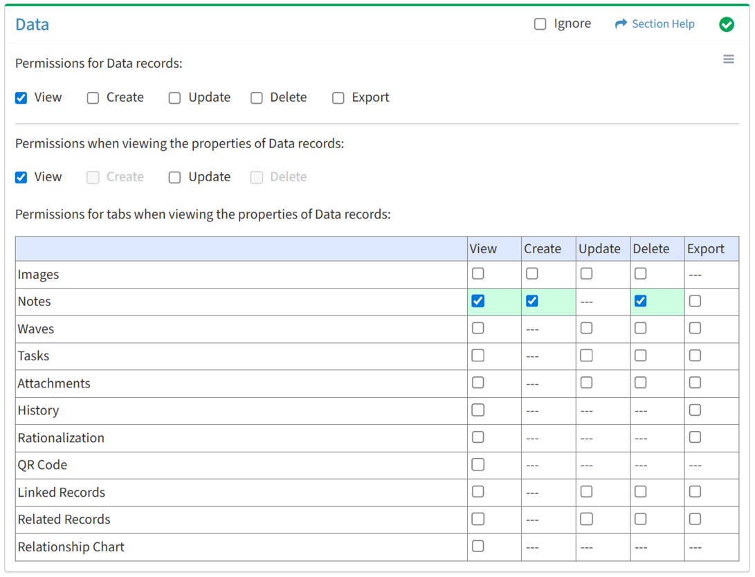 - Enable View, Create, Delete, or Export access for the Notes tab