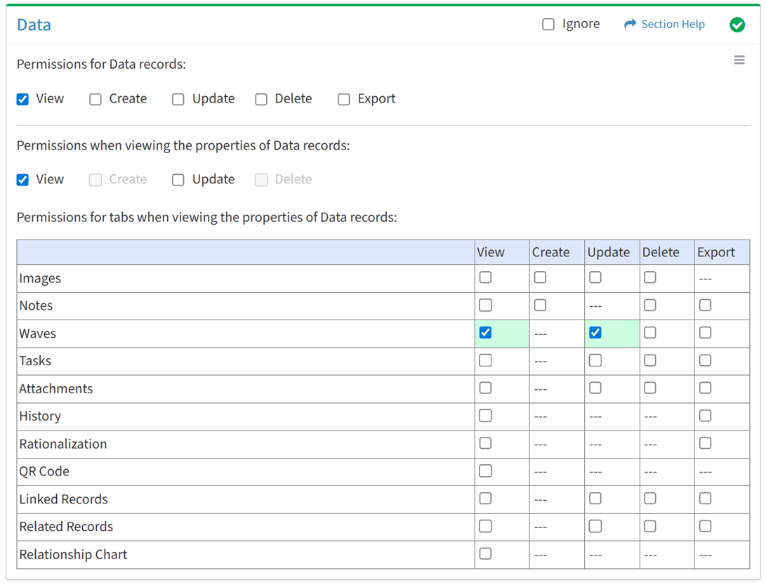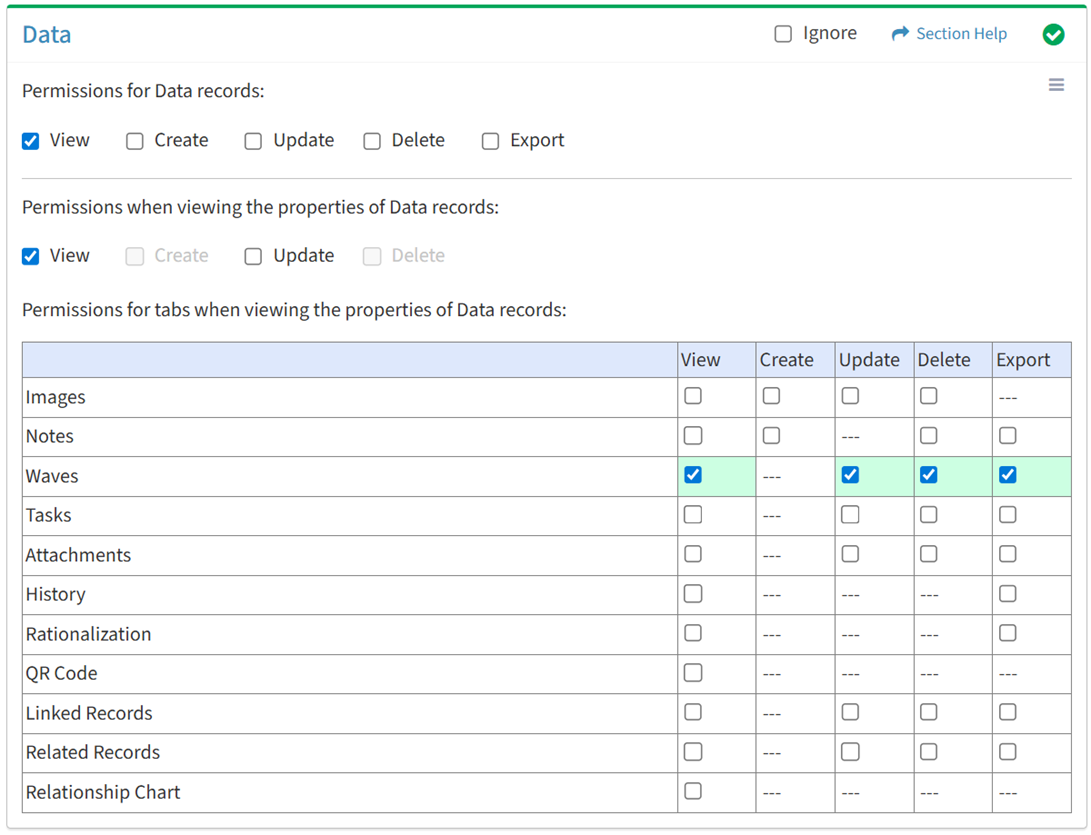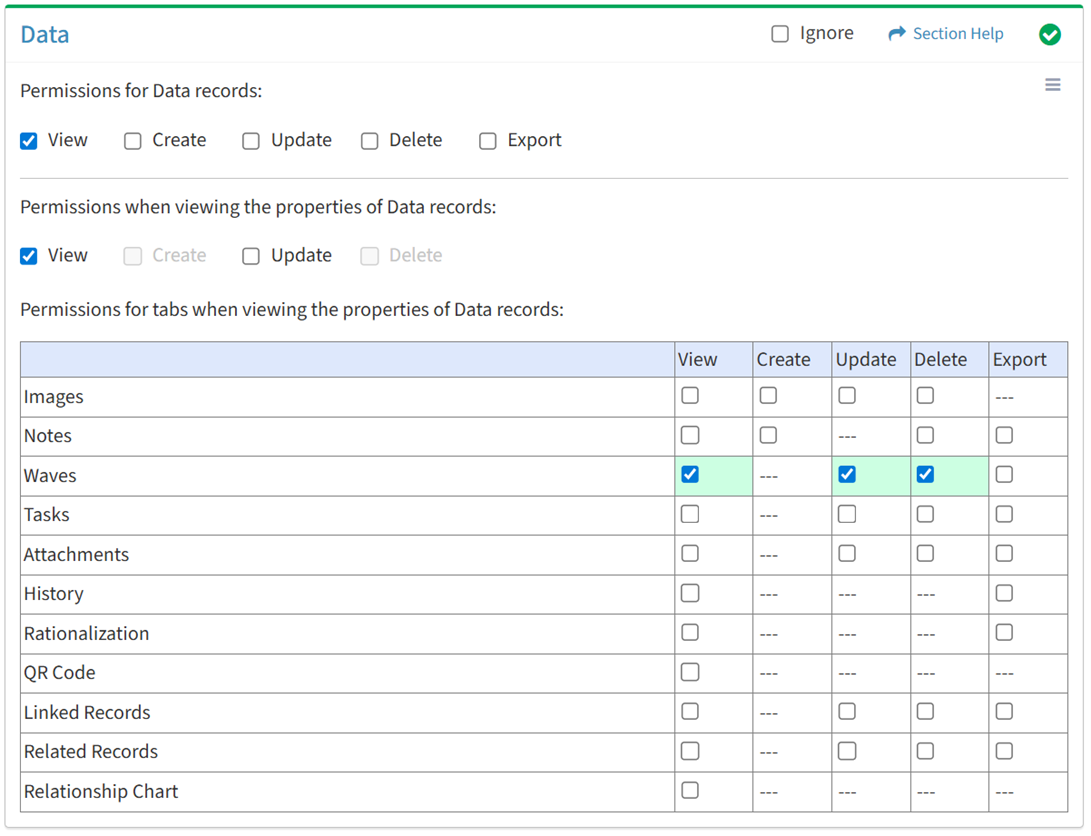 - Enable View, Update, Delete, or Export access for the Waves tab