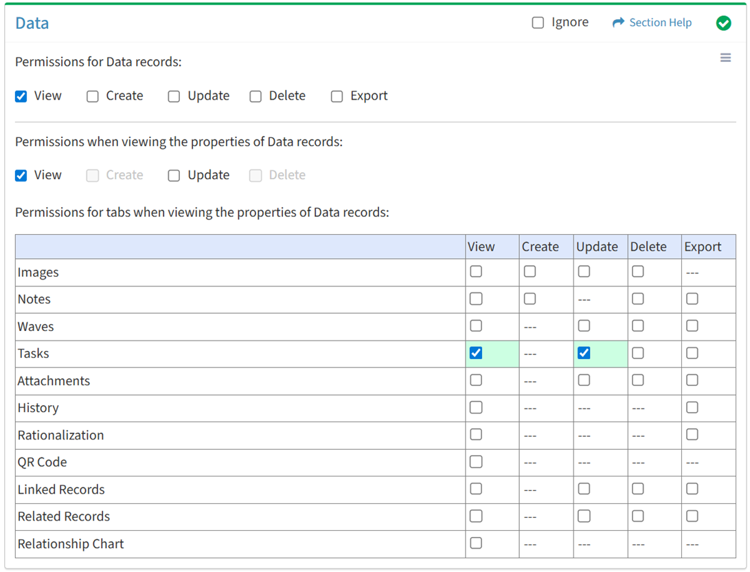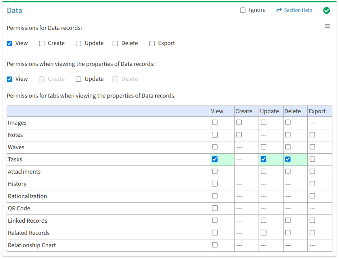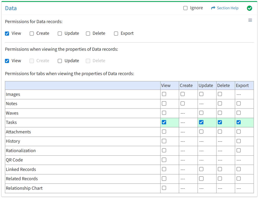 - Enable View, Update, Delete, or Export access for the Tasks tab