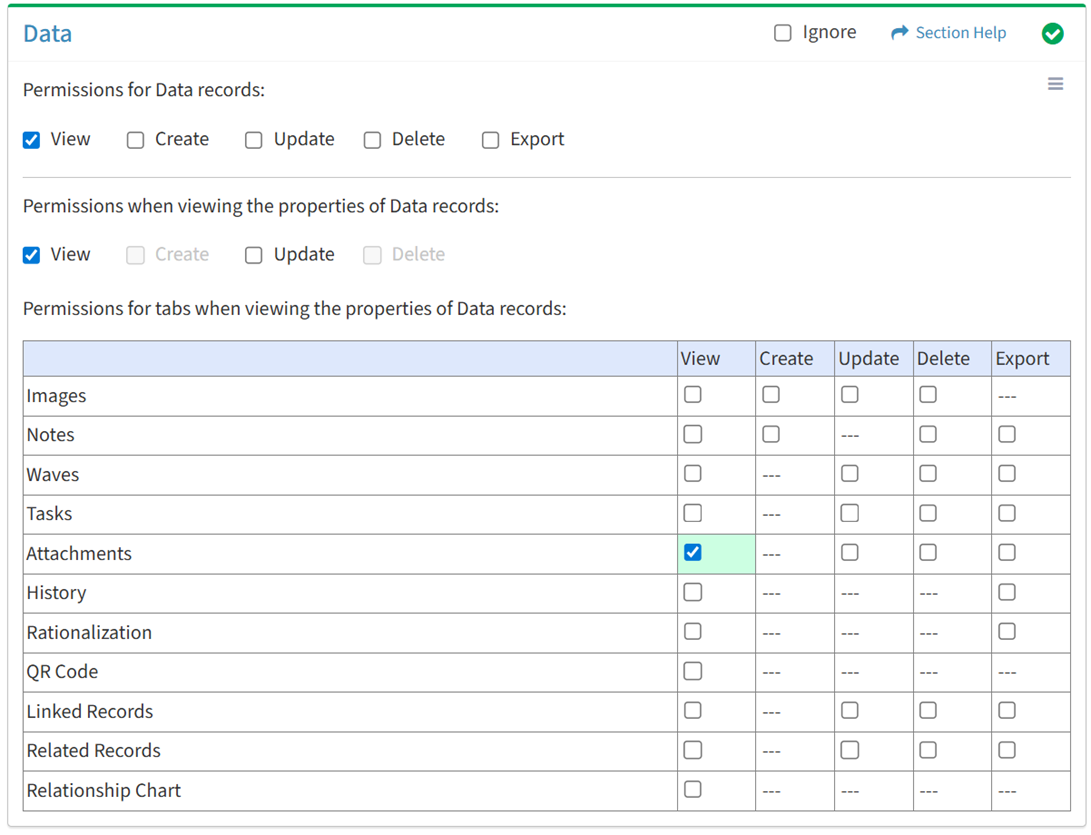 From the Data tab, you can enable View access for attachments when viewing the properties of data.