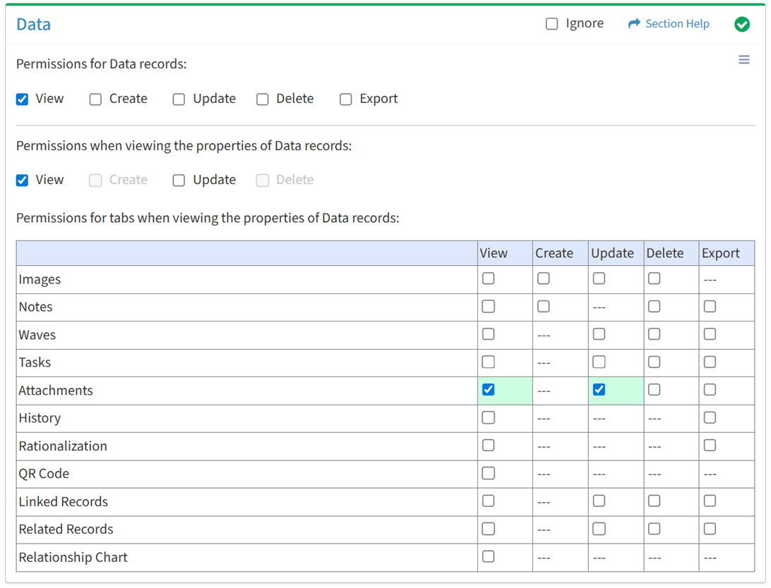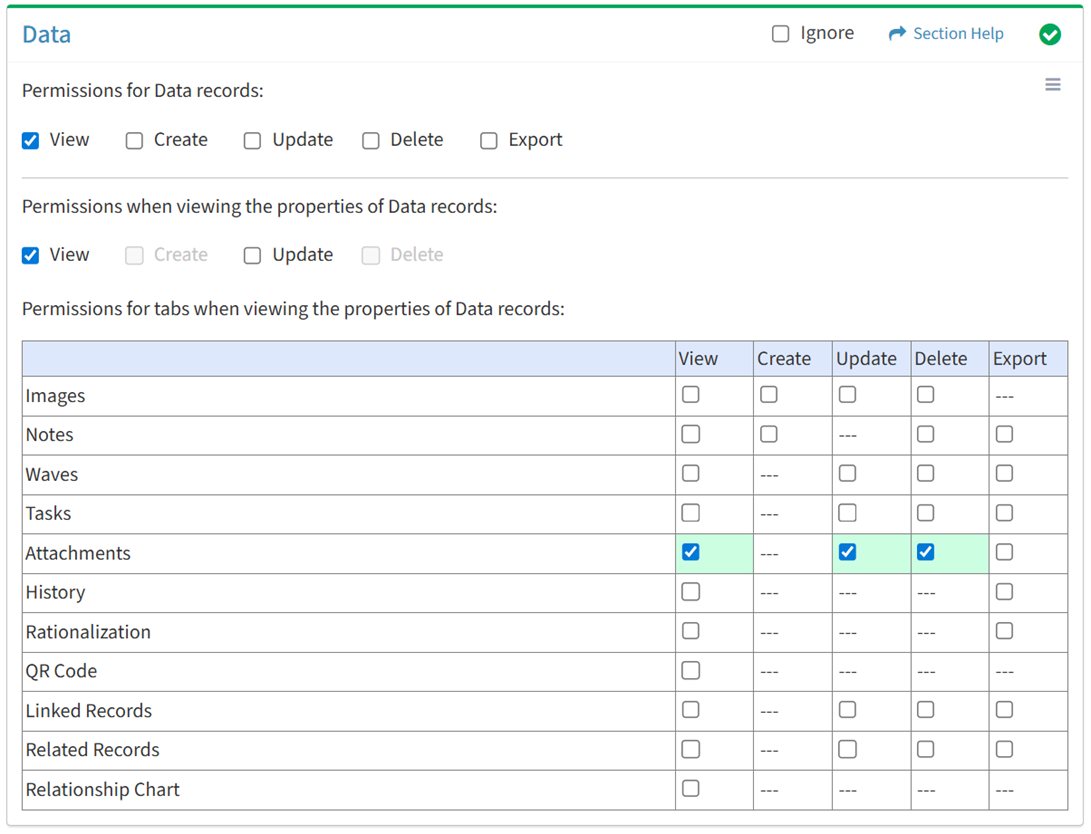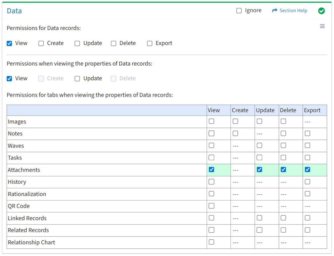 - Enable View, Update, Delete, or Export access for the Attachments tab