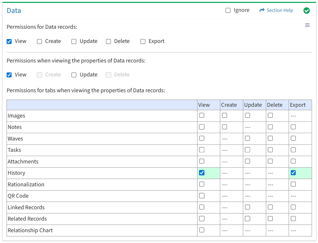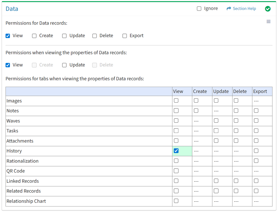 From the Data tab, you can enable View access for the history when viewing the properties of data.