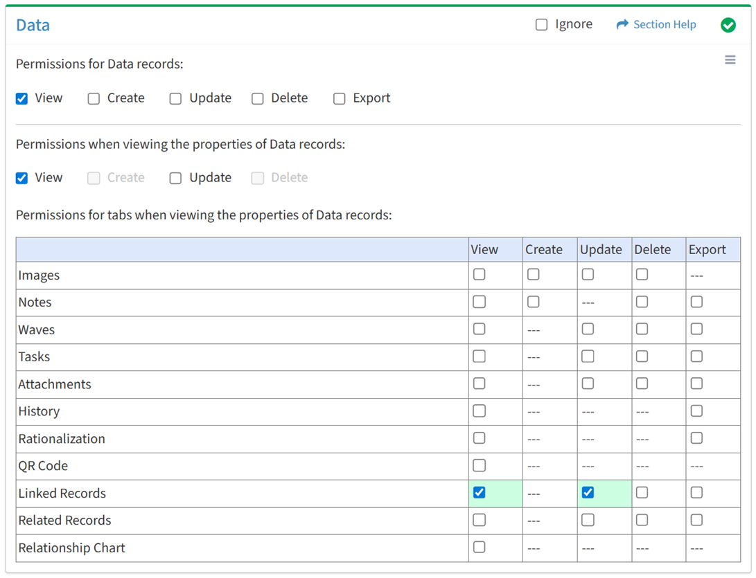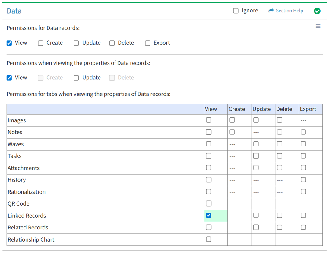 - Enable View, Update, Delete, or Export access for the Linked Records tab