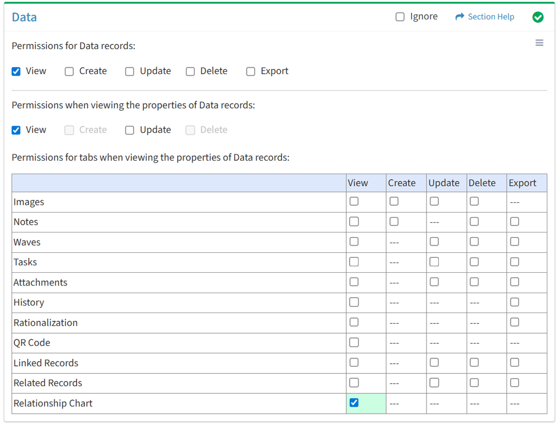 From the Data tab, you can enable View access for related records when viewing the properties of data.
