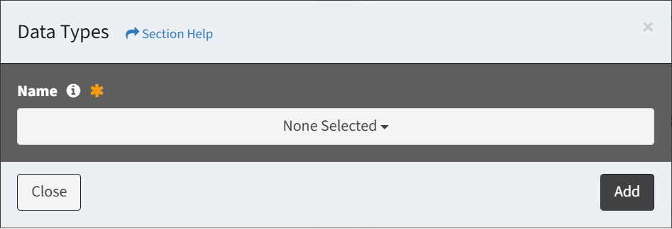 - Select data types from the Name drop down and then click the Add button. Click the Close button to cancel the operation.