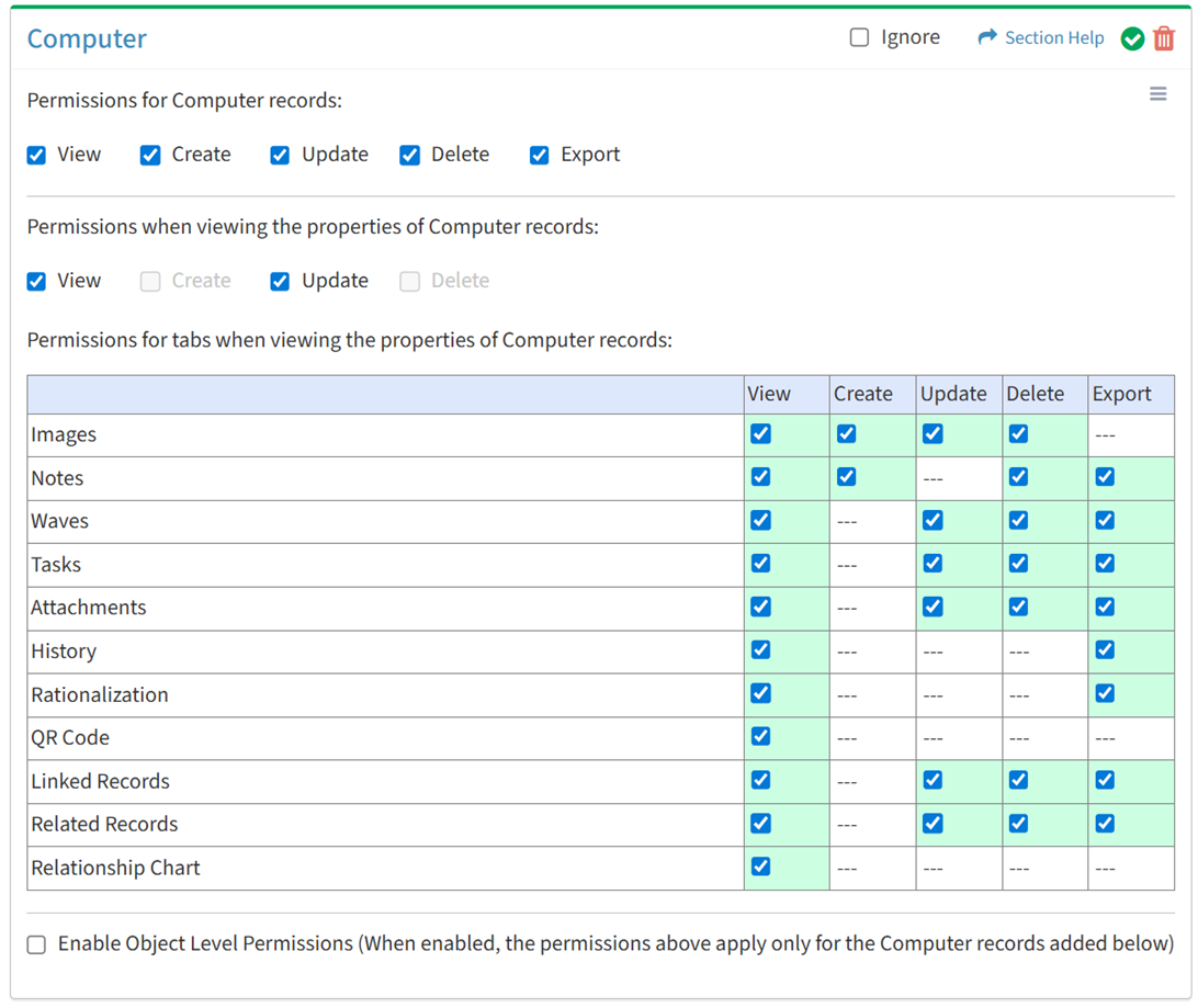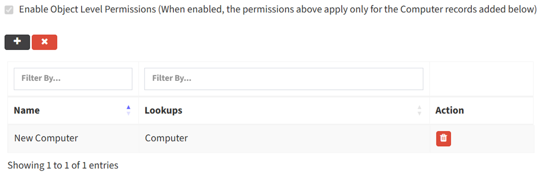 NOTE: Object level permissions restricts access to the data records selected. Users cannot be assigned to more than one Security Group with the same module data type (e.g. Computer) if any of those data types include object level permissions.