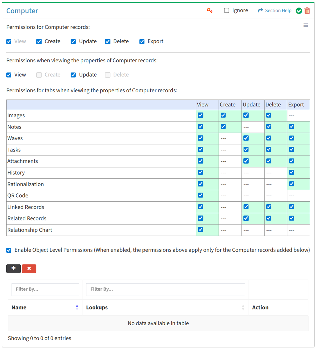 NOTE: Deleting all data records of a data type (either from the Data Type tab (e.g. Computer) or the Data module) does not disable object level permissions and results in access to no data records of the data type.