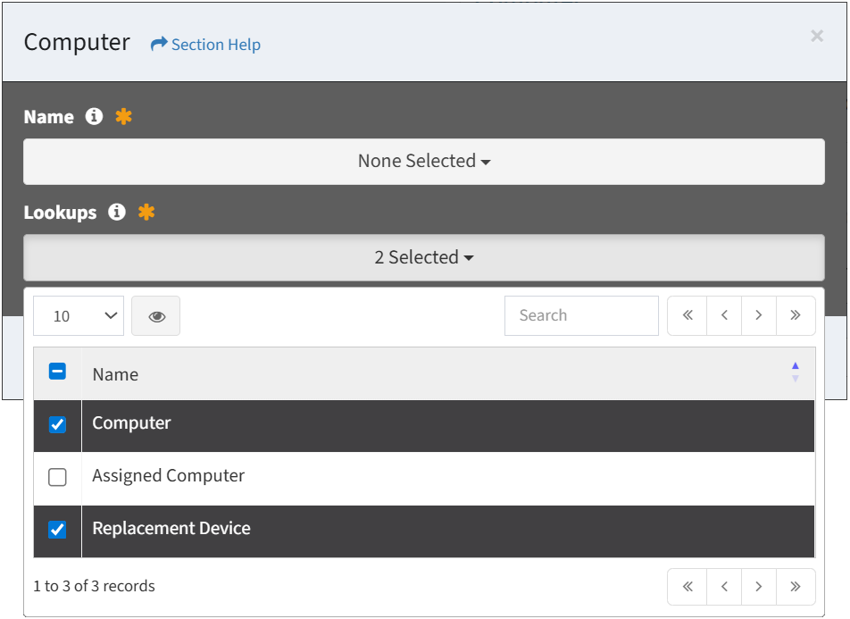 - The primary lookup is selected by default (and hidden when no aliases are instantiated). Selected lookups will filter data types by the selected name on each column. In the example below, the selected Computer data type will filter on both the Computer and Replacement Device columns of the data types where the lookups are instantiated (e.g. Computer).