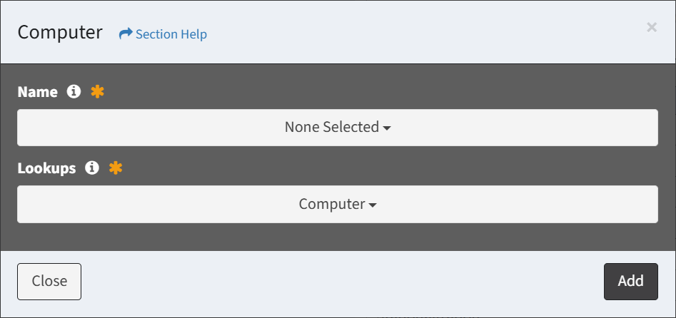 - Select data records from the Name drop down and then click the Add button. Click the Close button to cancel the operation.