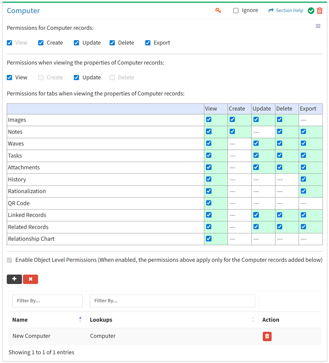 From the Data Type tab (e.g. Computer), you can add data records of a data type to restrict access to when enabling object level permissions. To add data records: