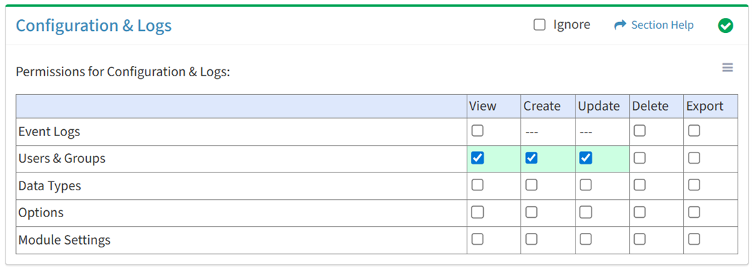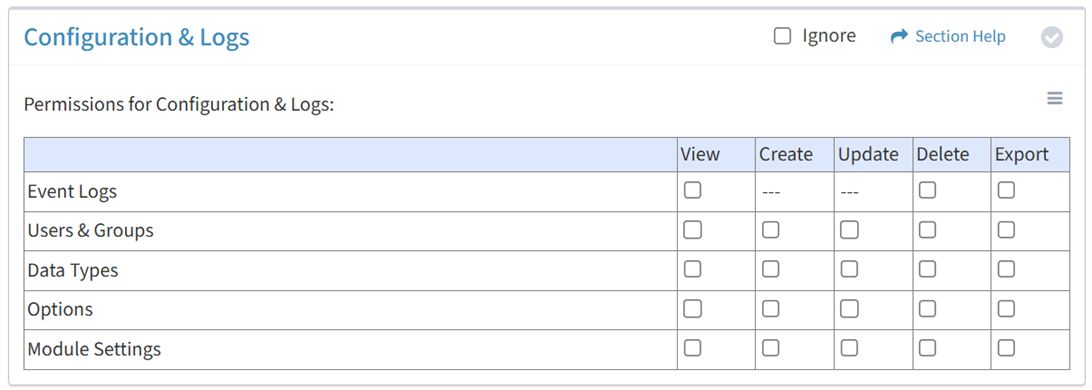 From the Configuration & Logs tab, you can ignore configuration and logs permissions from this security group by selecting Ignore. This option is used when overlaying multiple security groups and configuration and logs permissions are set by a different security group. Not enabling permissions on the Configuration & Logs tab, without selecting Ignore, results in no access, as overlaid security groups assume the most restrictive permissions.
