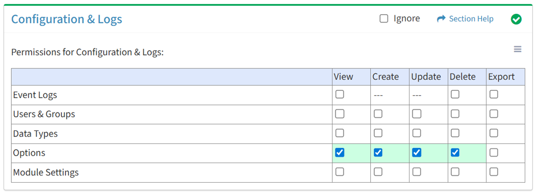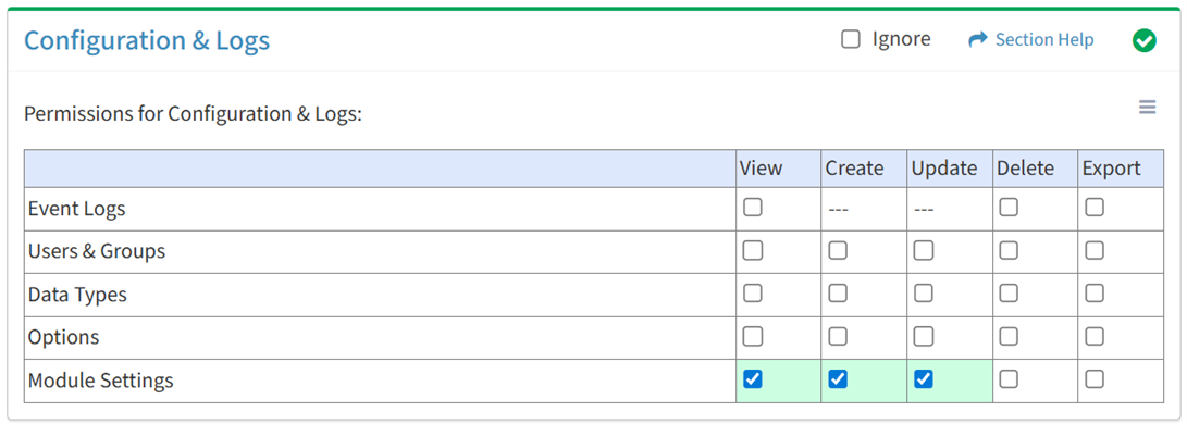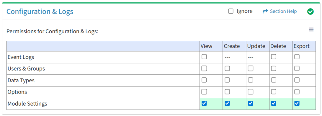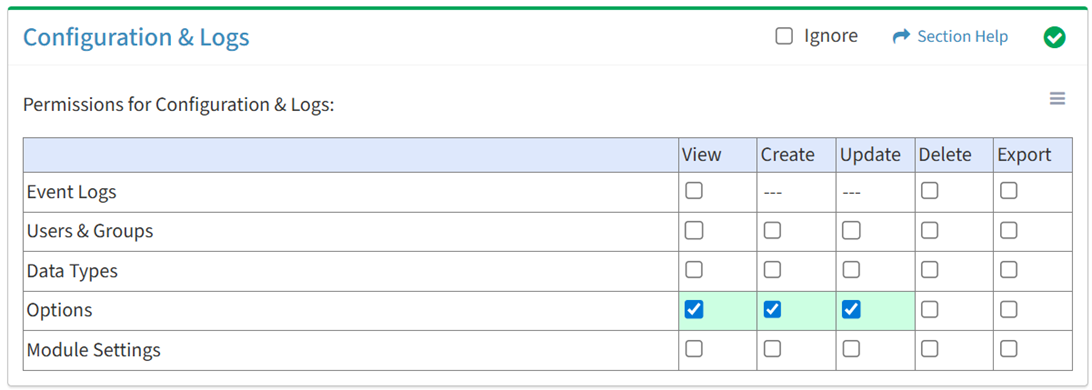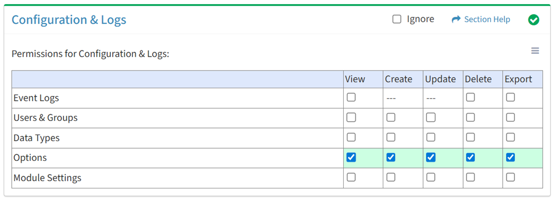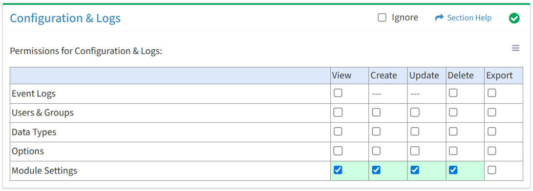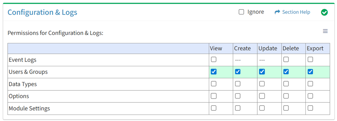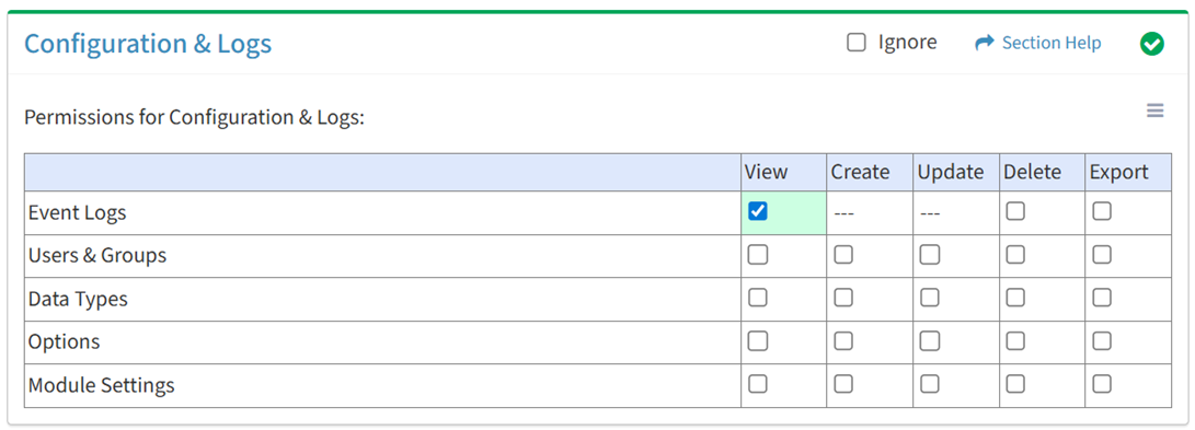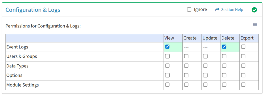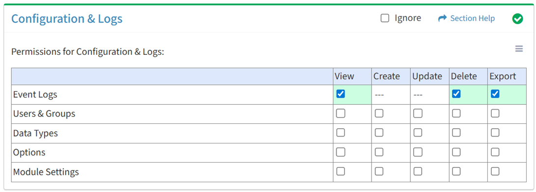 The Configuration & Logs tab provides the ability to enable access to Event Logs, Users & Groups, Data Types, Options, and Module Settings.