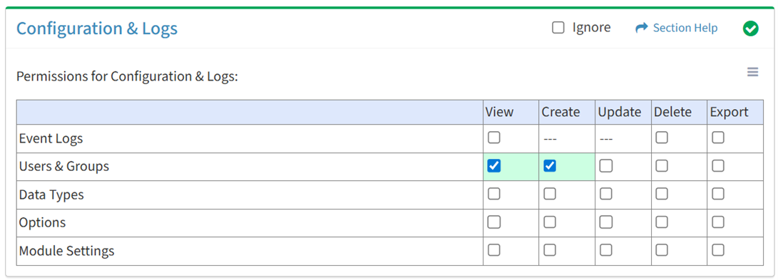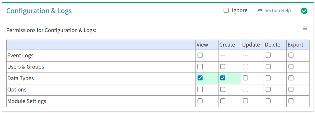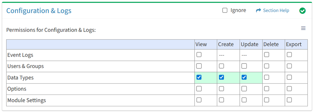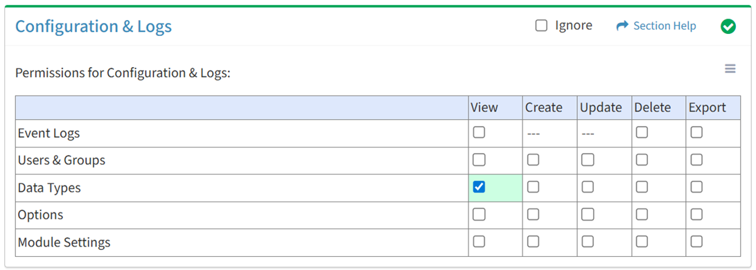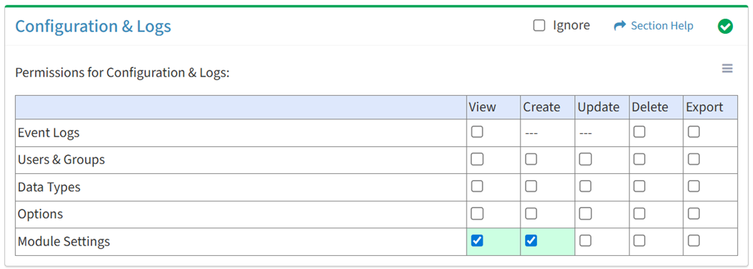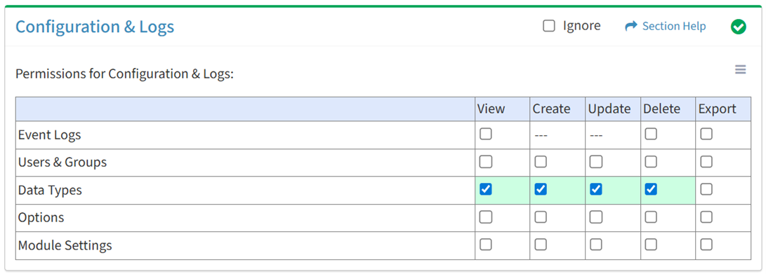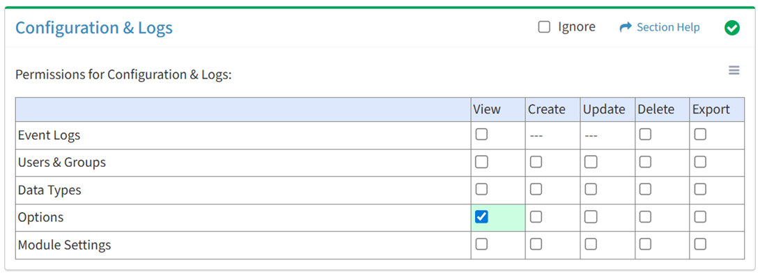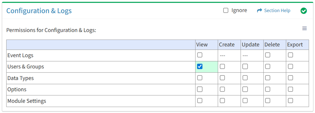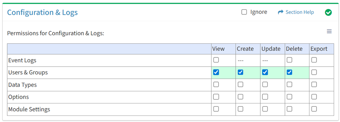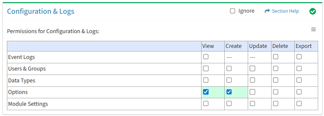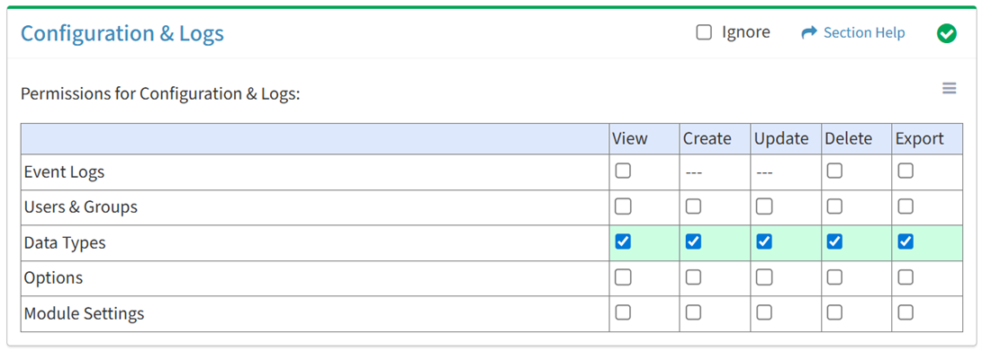 The Configuration & Logs tab provides the ability to enable access to Event Logs, Users & Groups, Data Types, Options, and Module Settings.