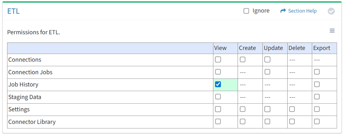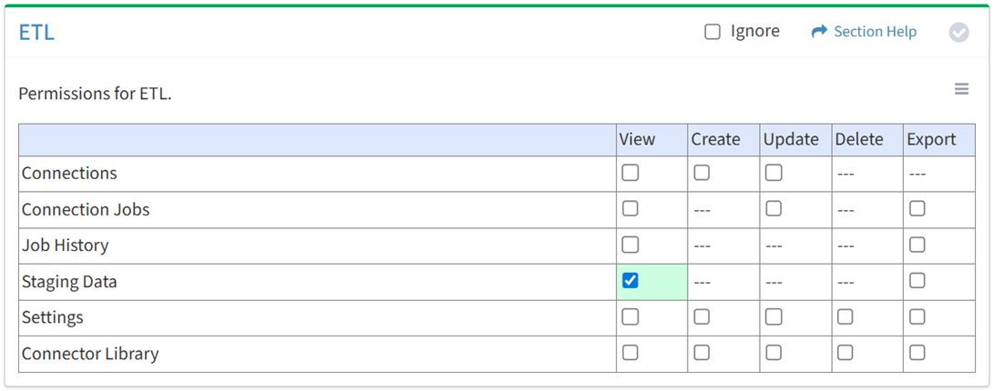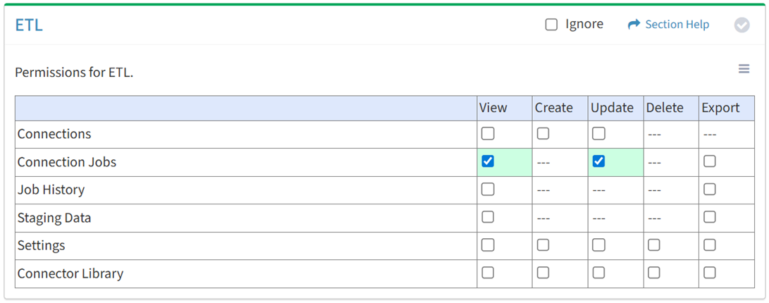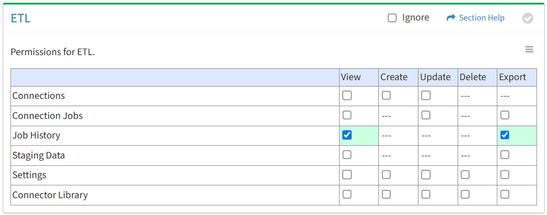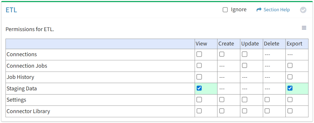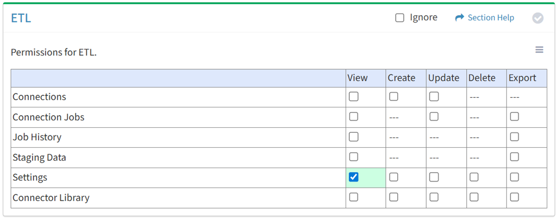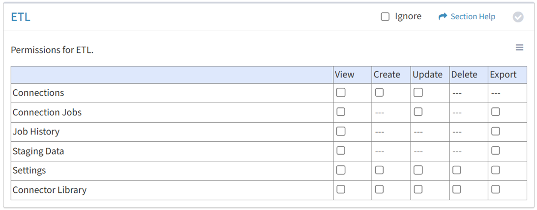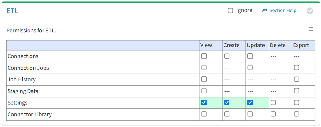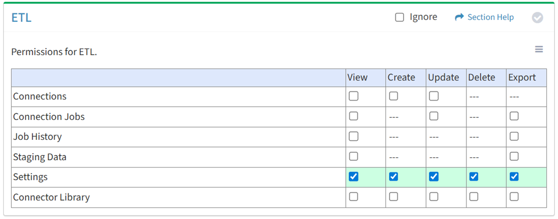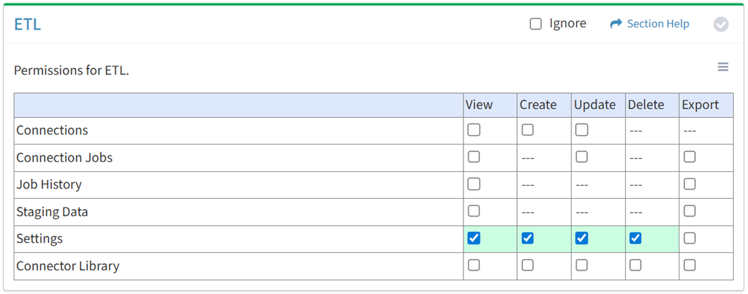 From the ETL tab, you can ignore ETL permissions from this security group by selecting Ignore. This option is used when overlaying multiple security groups and ETL permissions are set by a different security group. Not enabling permissions on the ETL tab, without selecting Ignore, results in no access, as overlaid security groups assume the most restrictive permissions.