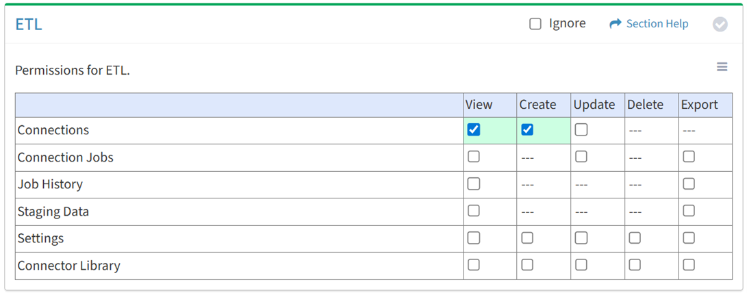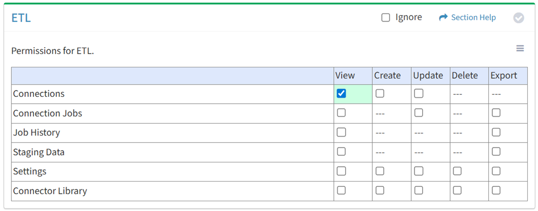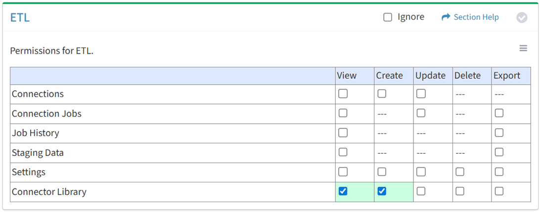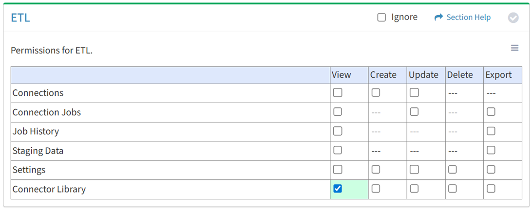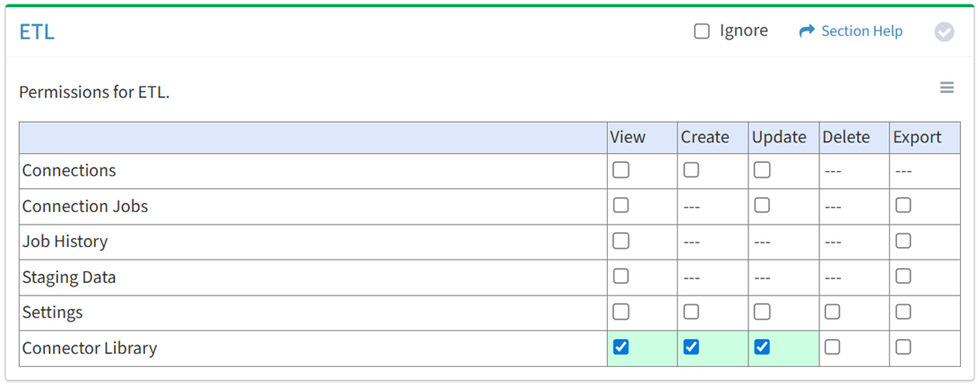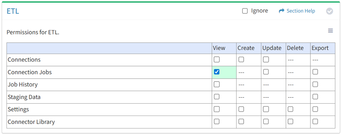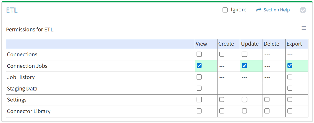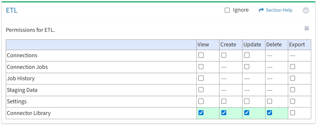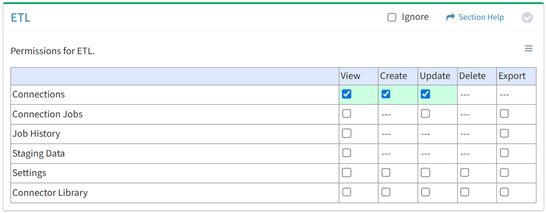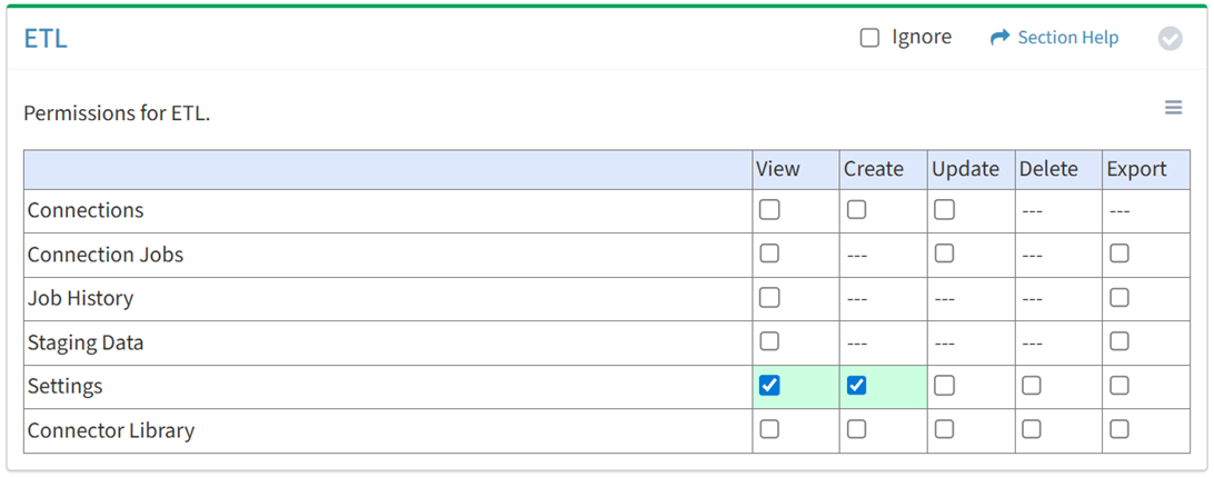 From the ETL tab, you can ignore ETL permissions from this security group by selecting Ignore. This option is used when overlaying multiple security groups and ETL permissions are set by a different security group. Not enabling permissions on the ETL tab, without selecting Ignore, results in no access, as overlaid security groups assume the most restrictive permissions.