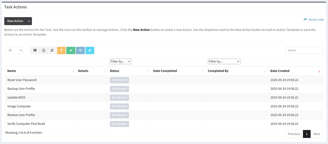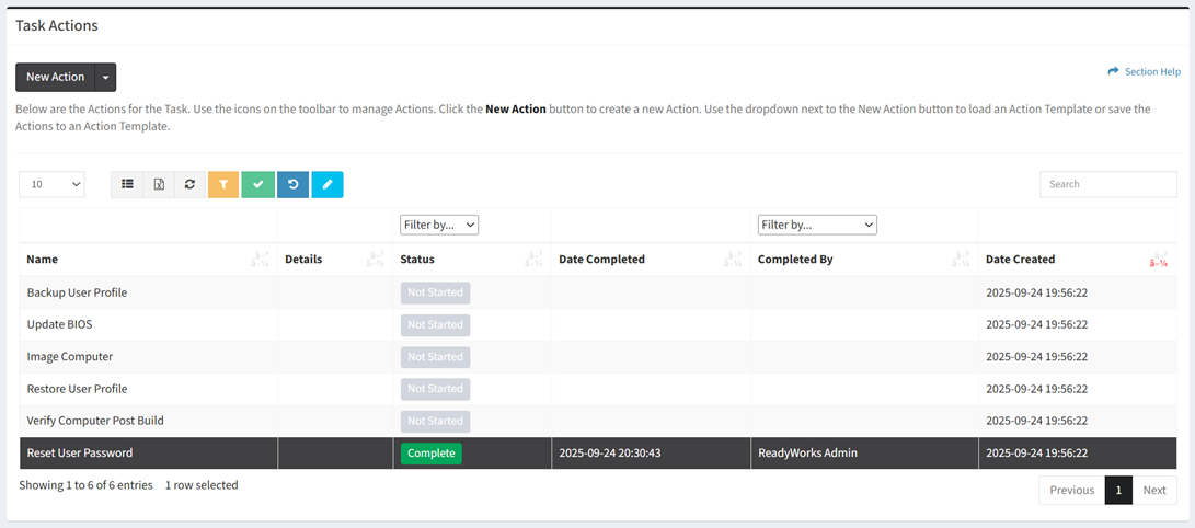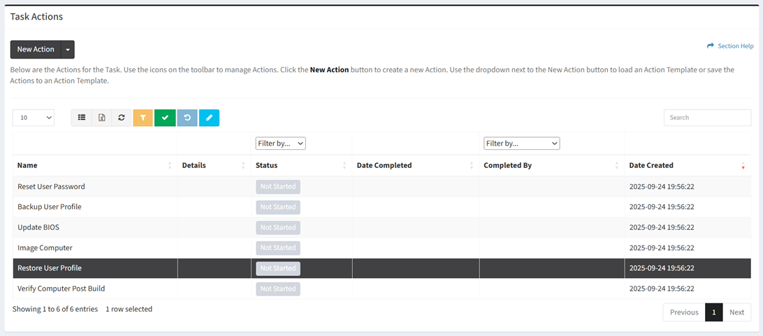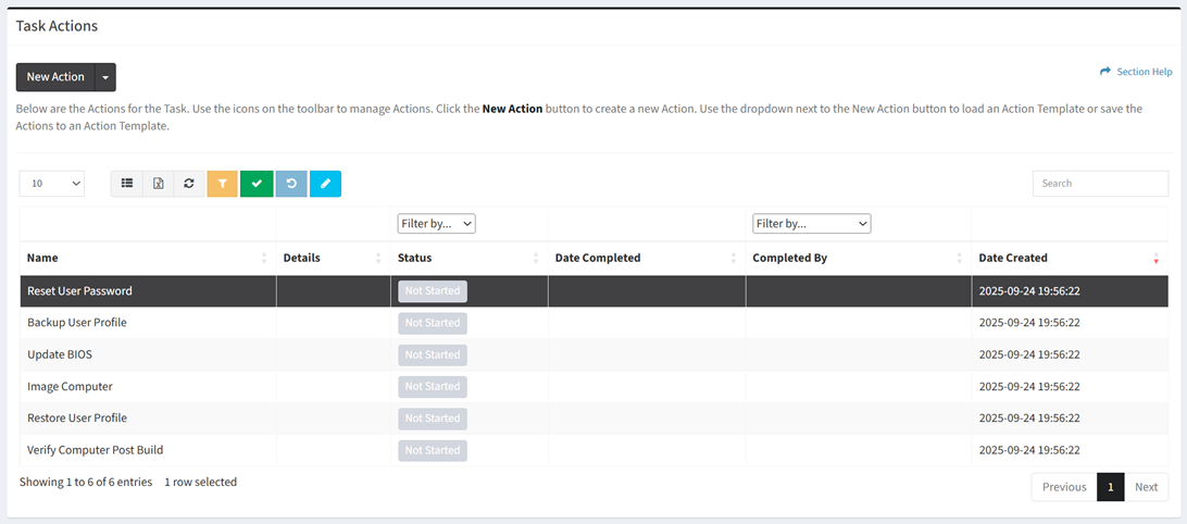 - Status – Status of the task action (Not Started, Complete)