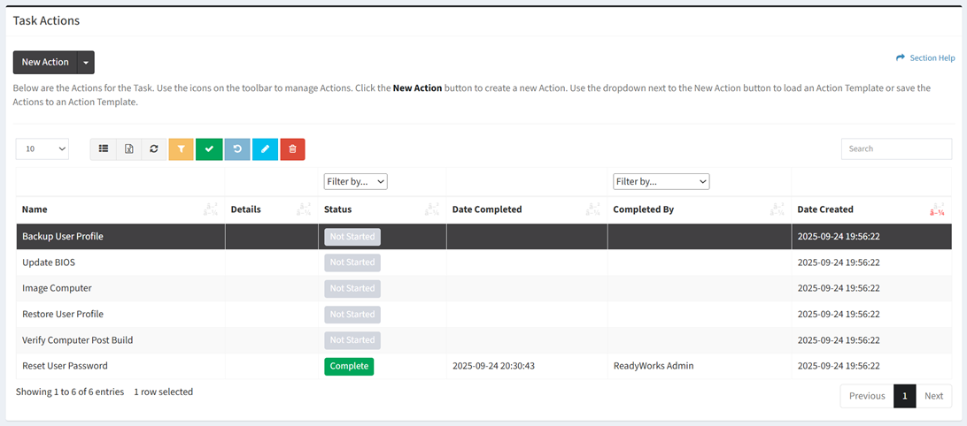 - Complete task actions by selecting a task action (row) and clicking the Complete Action button on the toolbar