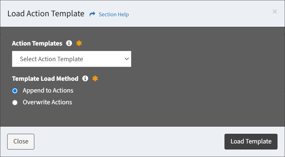 - Select Load Template from the New Action drop down to bring up the Load Action Template dialog