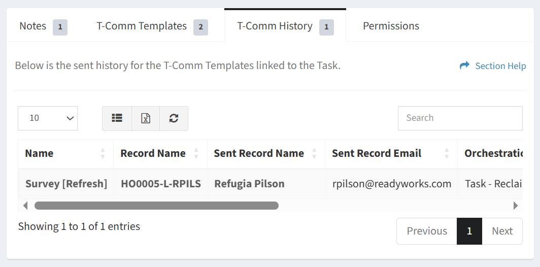 The T-Comm History tab provides the ability to view the T-Comm sent history of tasks.