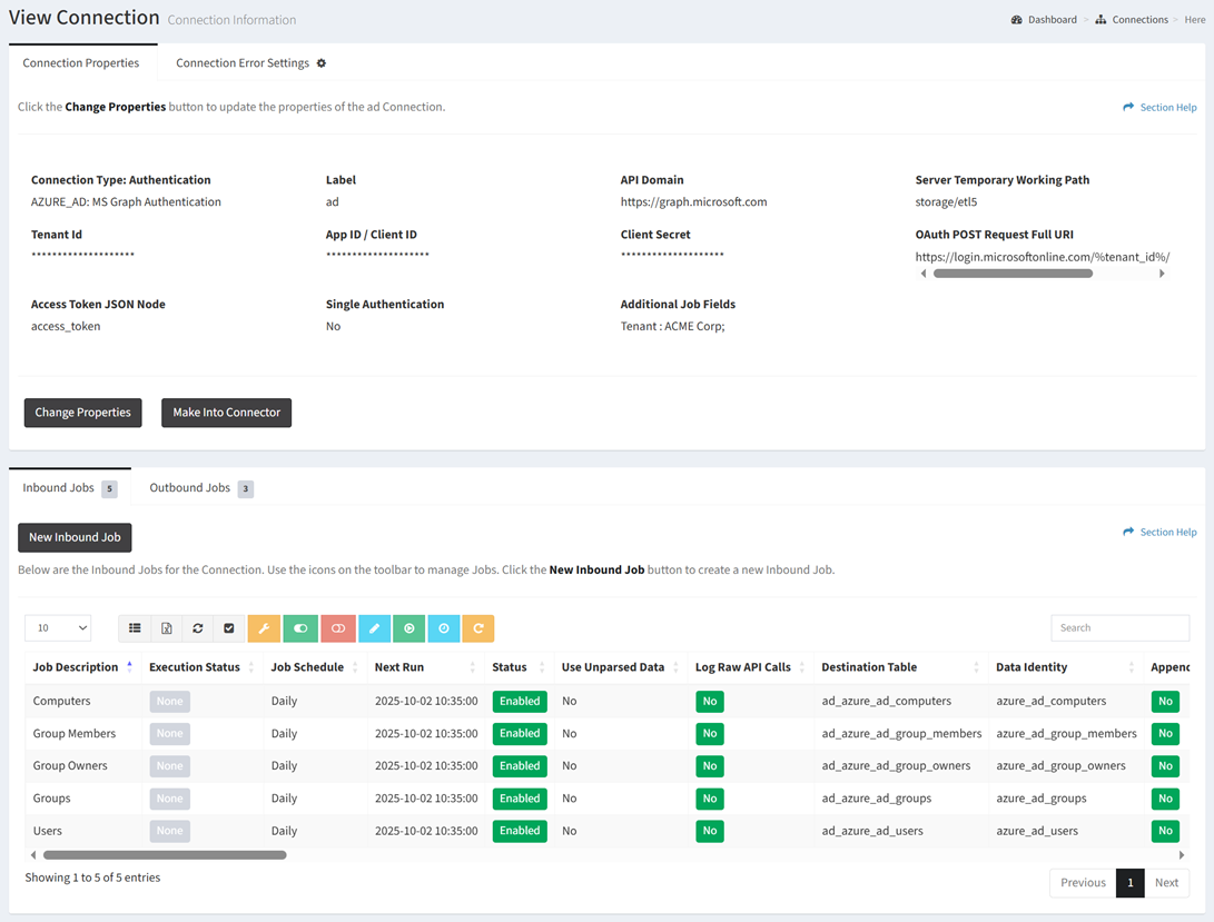 - View, create, override error settings, enable, disable, update, run, set runtime, reset, and delete inbound jobs for the connection