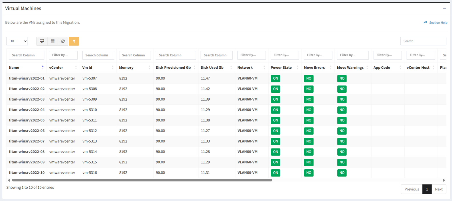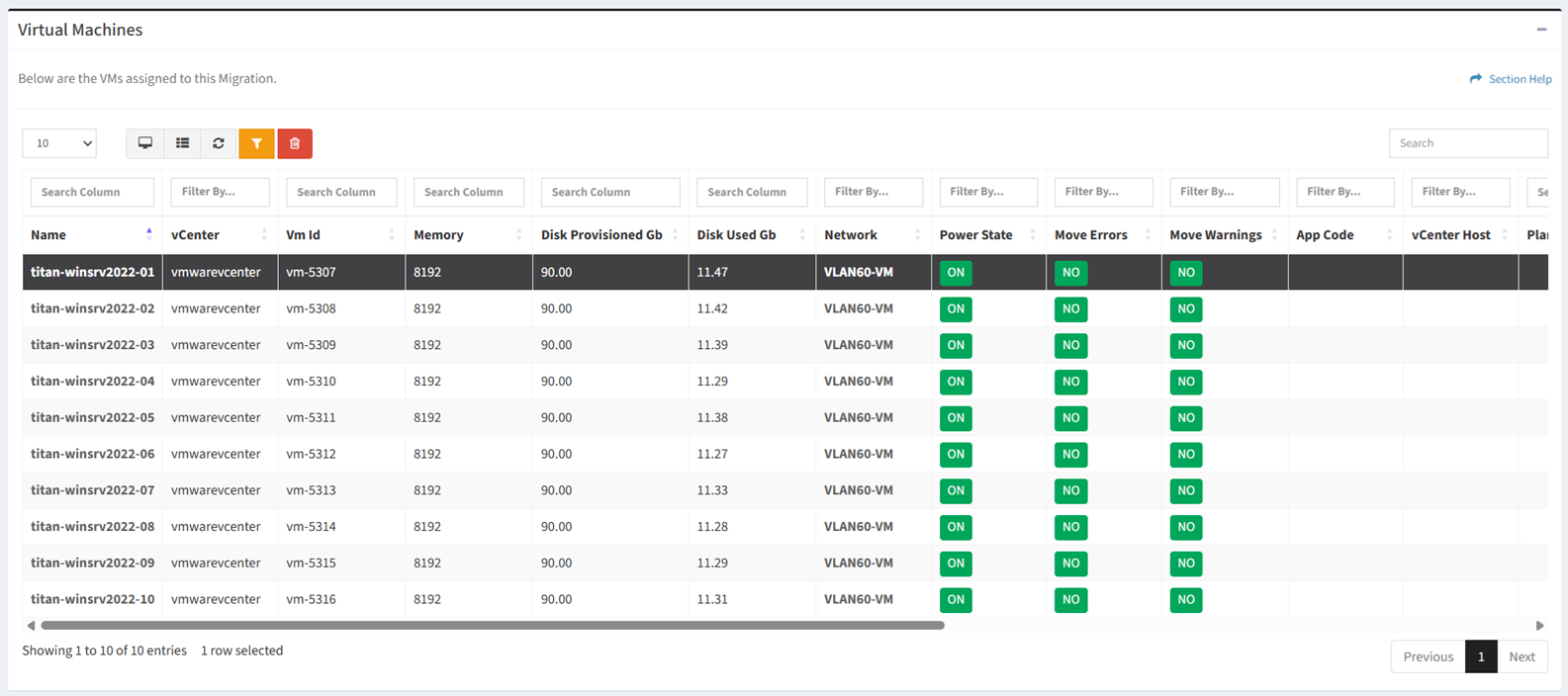 - Remove VMs from the migration by selecting one or more VMs (rows) and clicking the Remove VMs from Migration button on the toolbar