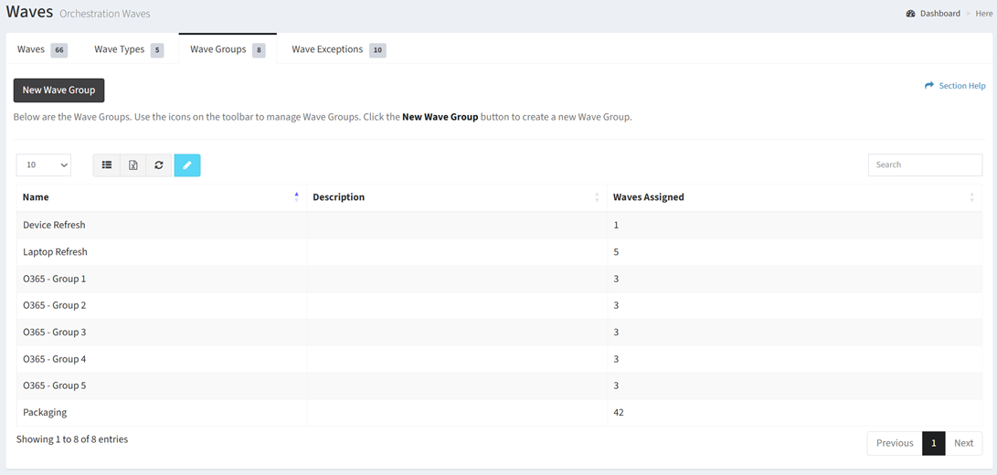 - Edit wave groups by selecting a wave group (row) and clicking the Edit Wave Group button on the toolbar