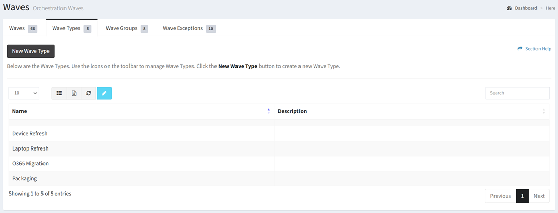 The Wave Types tab provides the ability to create types to assign to your orchestration waves.